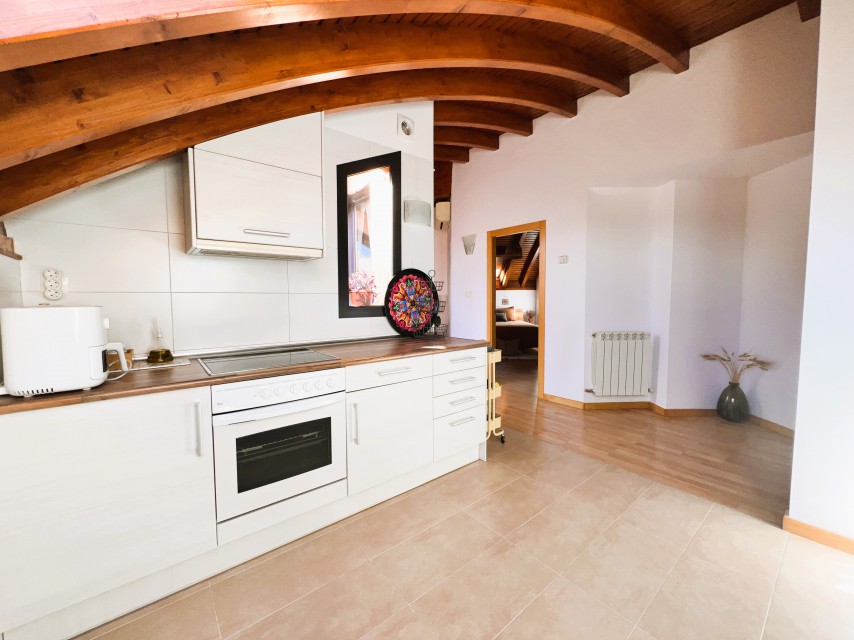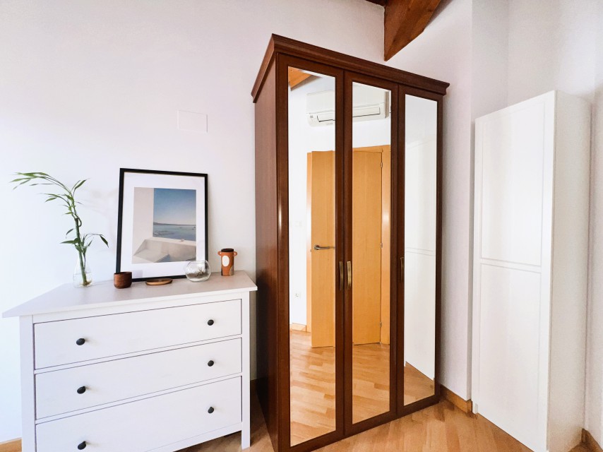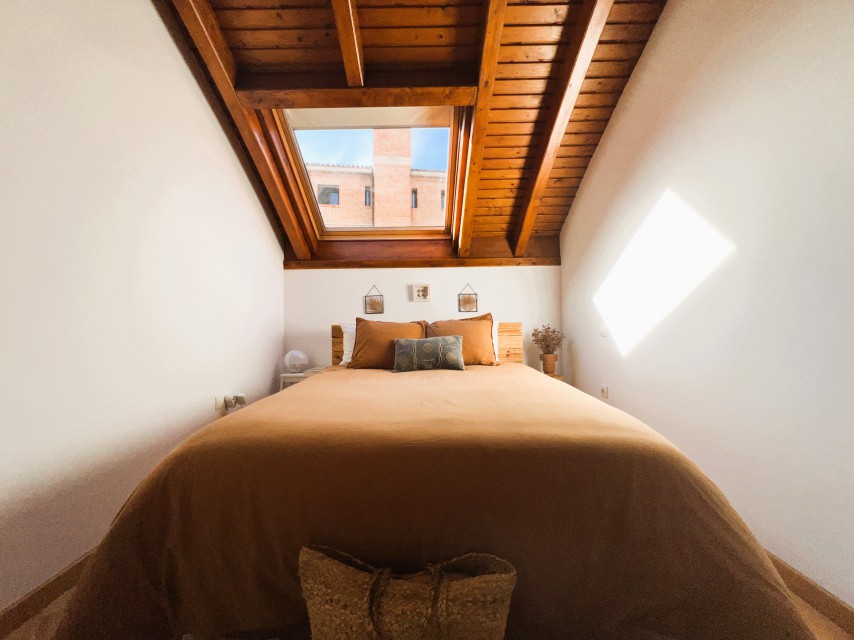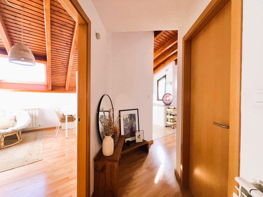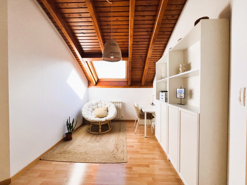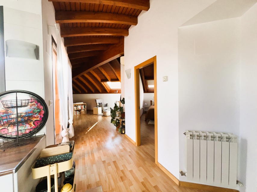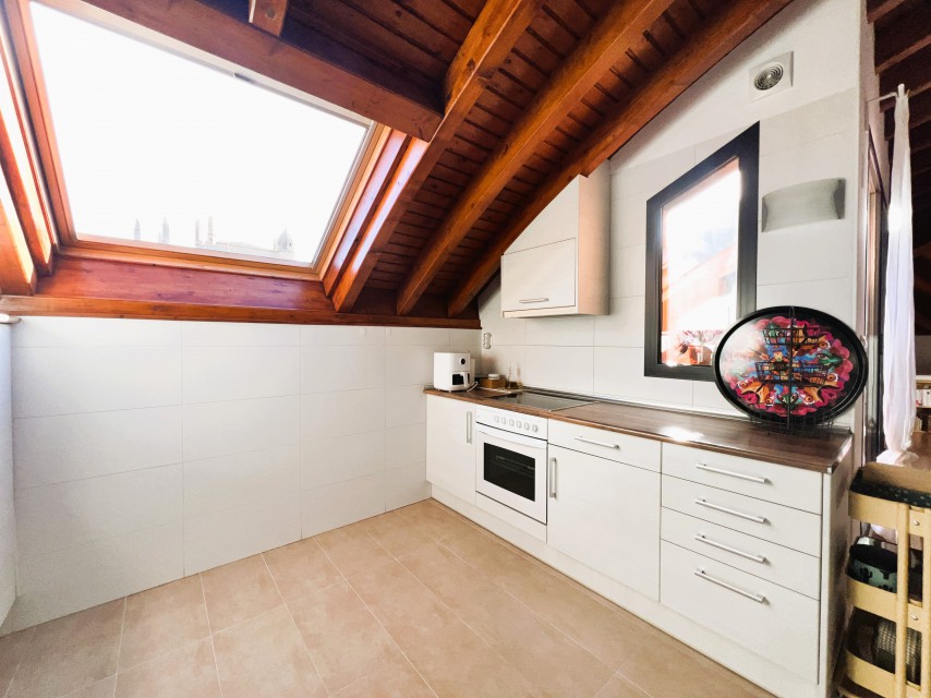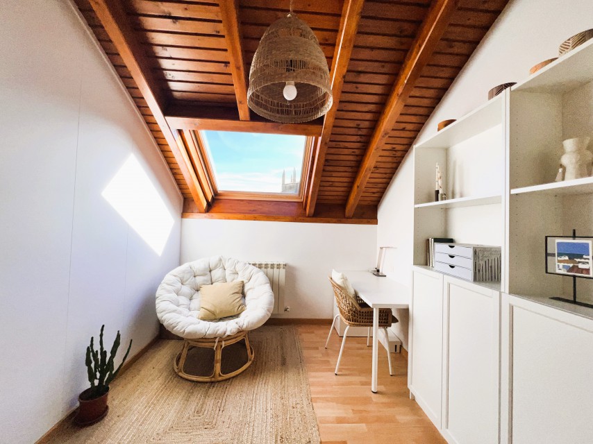 Vivienda-ático de superficie útil de 71 m² distribuida en salón y cocina, 2 dormitorios y un baño completo con plato de ducha con mampara. Suelos de parquet y techos altos de madera lo que hace que la vivienda sea muy acogedora y a su vez le da amplitud. Zona de cocina distribuida en dos bancadas. Ventanas de Velux. Calefacción central con contador individual. Terraza muy intima con vistas a la Catedral y orientada al Sur. Plaza de garaje y trastero en la misma finca.